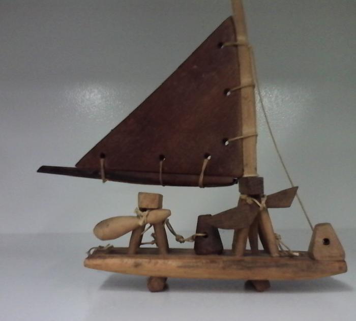 Peça que retrata jangada e artefatos, na vela lê-se: " lembrança do recife".