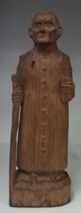 Peça que retrata homem com batina com 9 botões frontais, em uma mão traz bastão e na outra um livro.