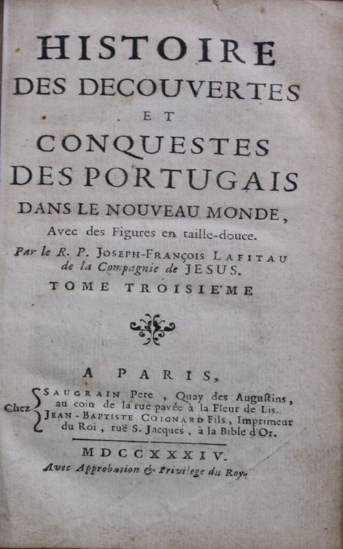 Obra de 14 livros em 4 tomos. Com aprovação e privilégio do rei. Vinhetas. Capitulares ornamentadas. Notas em corandel. Mappe=Monde pour servir a l'histoire des decouvertes et conquestes des Portugais dans le nouveau Monde (tomo I). Assinaturas e reclamos. O tomo 3 possui 2 gravuras.