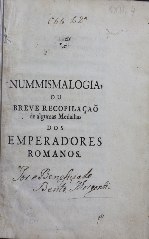 Nummismalogia, ou breve recopilaçaõ de algumas medalhas dos emperadores romanos [de ouro, prata, e cobre, que estaõ no Museo do Lourenço Morganti]